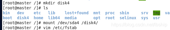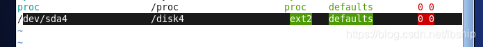 然后设置开启自动挂载 vim /etc/fstab在最后追加/dev/sda4 /disk4 ext2 defaults 0 0
